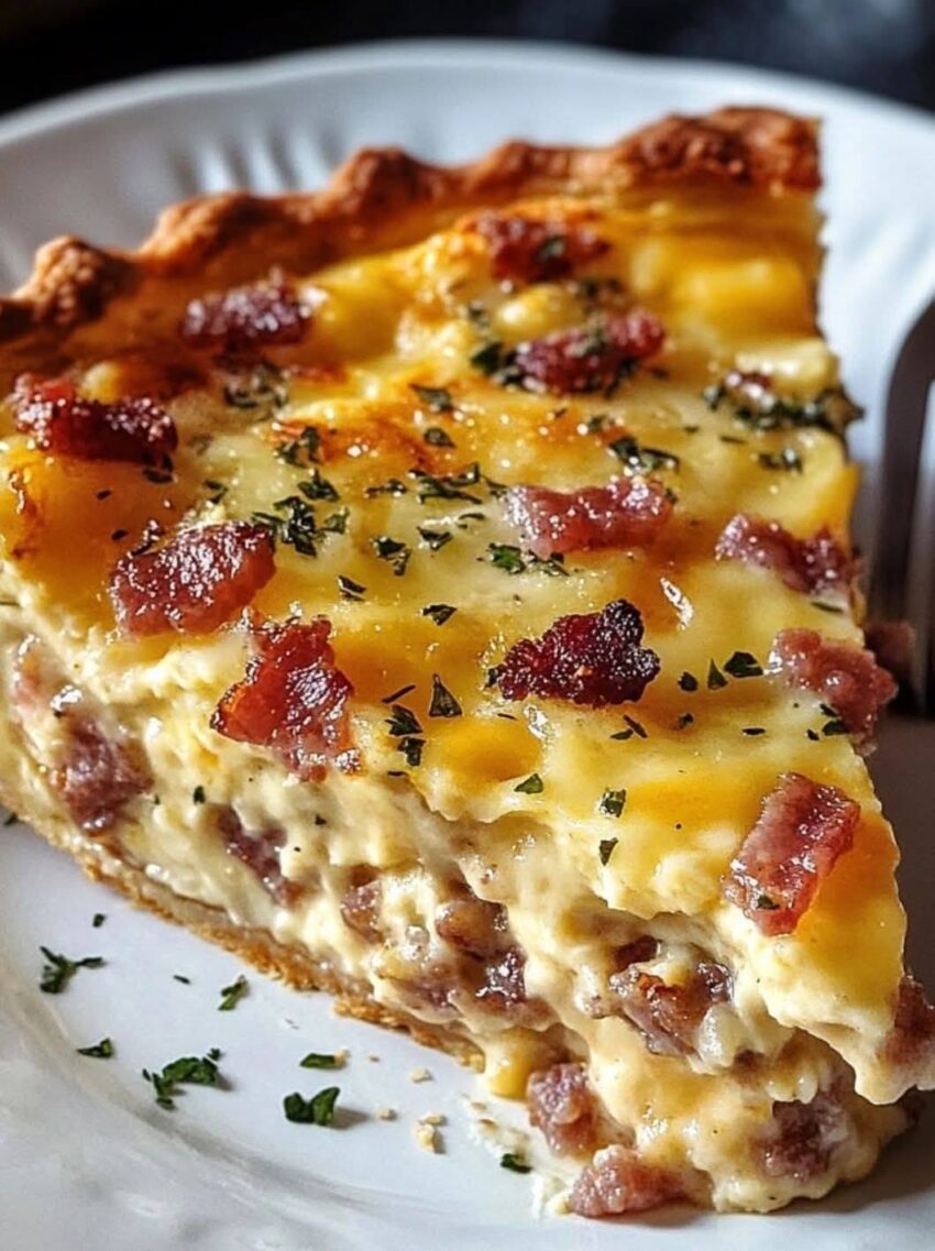 A bacon and cheese quiche is a rich, savory pie made with a flaky crust filled with eggs, cream, cheese, and crispy bacon.