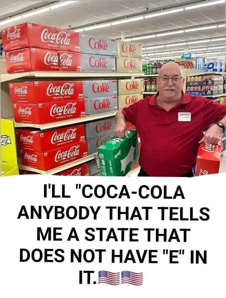 - The challenge: At the bottom, it says: “I’ll ‘Coca-Cola’ anybody that tells me a state that does not have ‘E’ in it.”