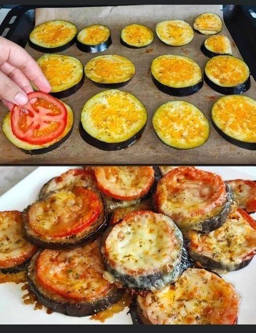 - Add tomato slices on top of the eggplant.