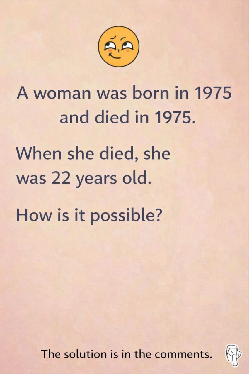 That sounds like the start of a classic riddle, but it’s incomplete. There are many versions that begin with “This woman was born in 1975…” and the answer depends on the rest of the clues.