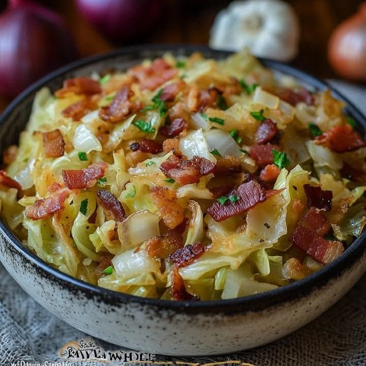 Here’s a hearty, flavorful recipe for Rustic Fried Cabbage with Crispy Bacon and Caramelized Onion 🥬🥓✨