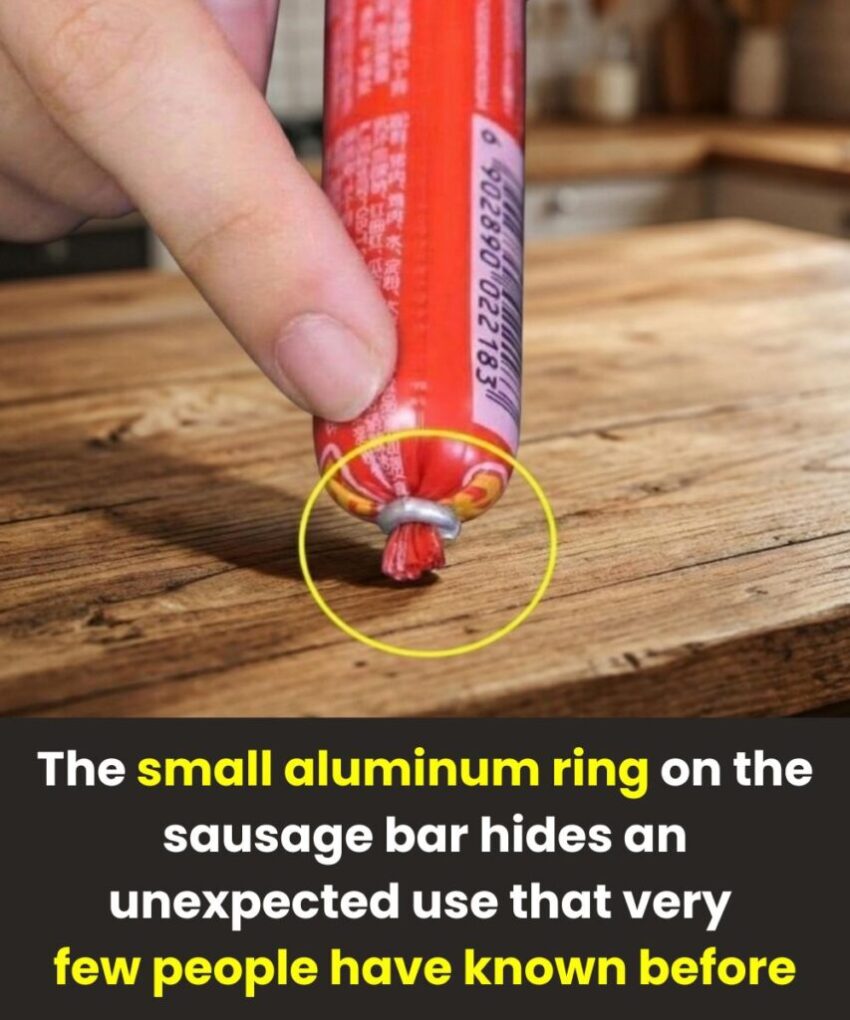 The aluminum ring on sausage packaging is just a factory sealing component, not a hidden tool or special feature.