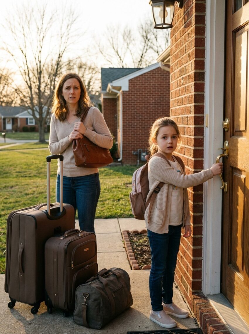 It looks like a quiet, possibly emotional moment. The woman and the child standing with suitcases suggest they’re either arriving somewhere new or leaving a place behind. The doorstep of a brick house gives a home-like, grounded setting, which makes the scene feel personal—like a move, a visit, or even a fresh start.