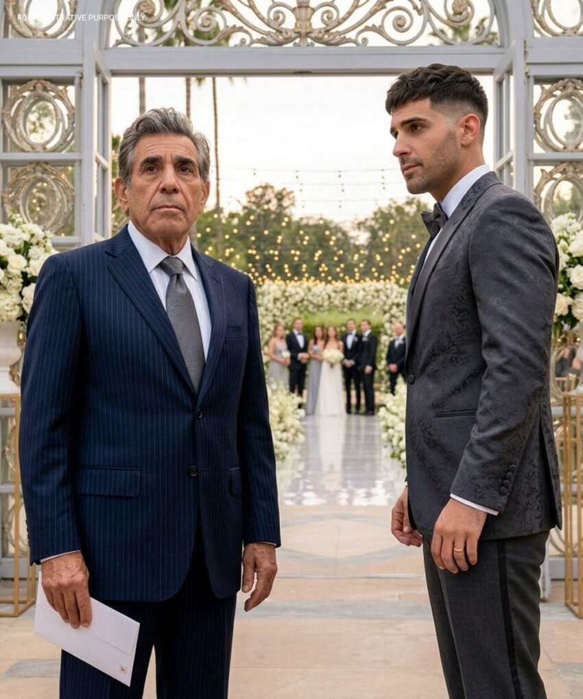 Behind him, the entrance to the hall stayed open. I could see people inside—chairs lined neatly, flowers arranged with care, a life event continuing as if nothing had shifted at the edge of it.