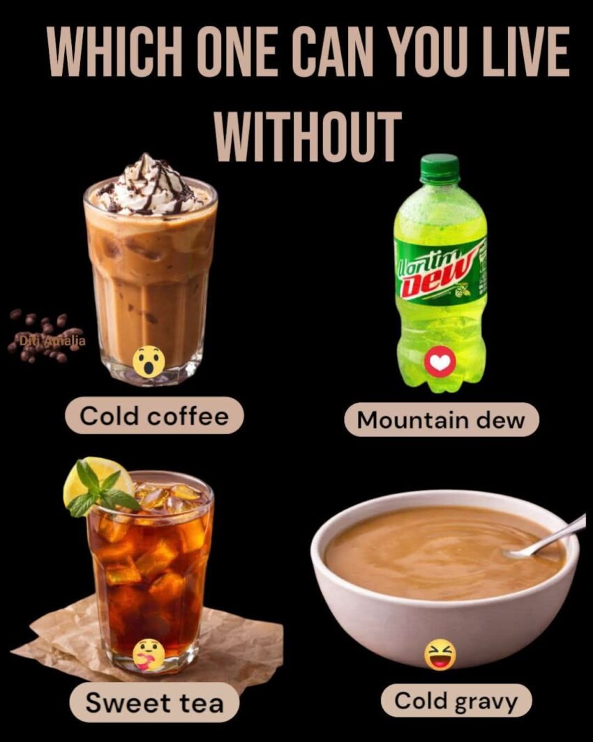 💡 Answer: You could probably live without cold gravy, since it’s not essential for hydration or energy like the drinks, and it’s an unusual option compared to the others.