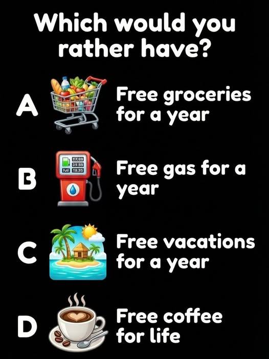 A) Free groceries for a year—it’s practical, covers so much, and gives you freedom to spend your money on other fun stuff (like vacations or coffee!) 😎