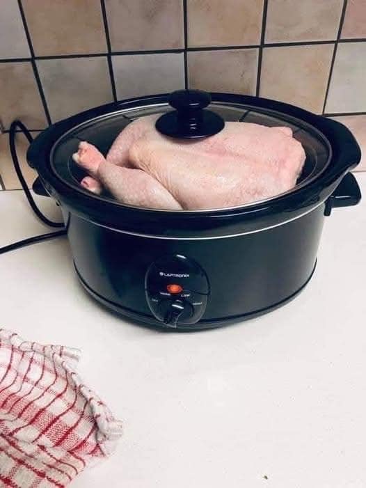 whole slow cooked chicken, I have sat it on foil balls, added an onion, cut in half. Will be kept on low for 8-9 hours! Looking forward to seeing how it turns out!